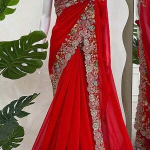 Pink Net Saree with Heavy Embroidered Blouse & Silver Border
