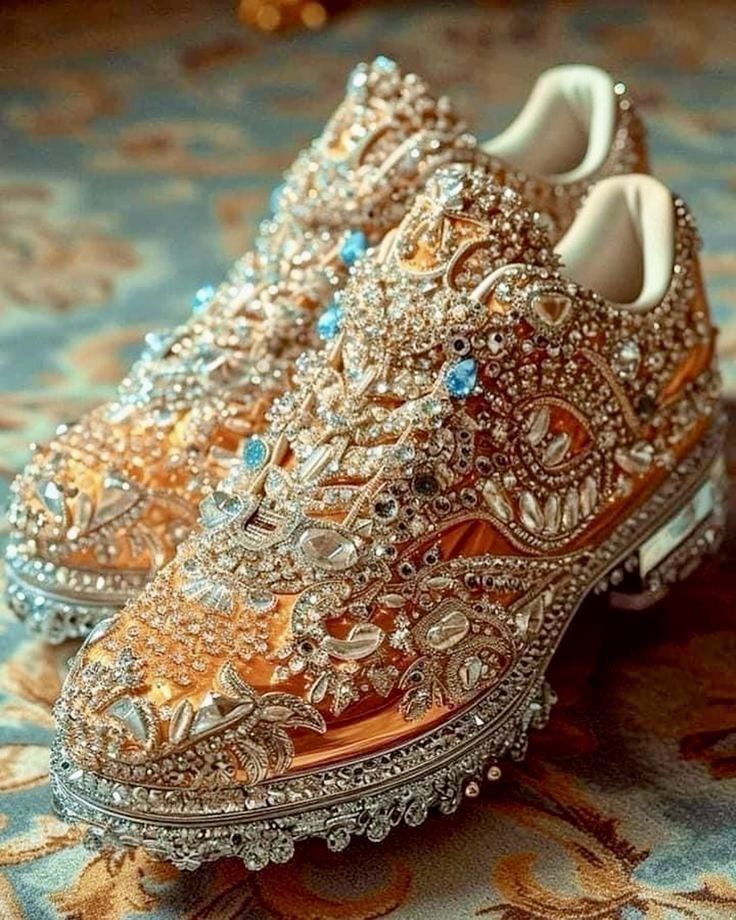 Design: Drenched in luxurious golden-orange tones, the sneakers feature intricate zardozi and stonework with dazzling silver and gold beads, reflective crystals, pearls, and pops of vibrant blue stones.