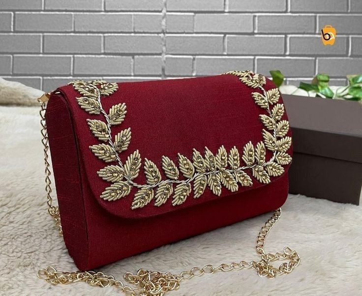 Elegant maroon clutch adorned with intricate golden leaf embroidery. Comes with a sleek golden chain strap, perfect for weddings, parties, and festive occasions.