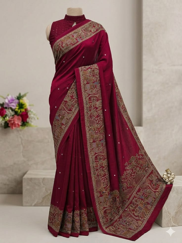 Rich maroon silk saree featuring an ornate embroidered pallu and broad border with traditional motifs. Finished with delicate butti work across the body for an elegant festive/wedding look. Comes with matching blouse piece