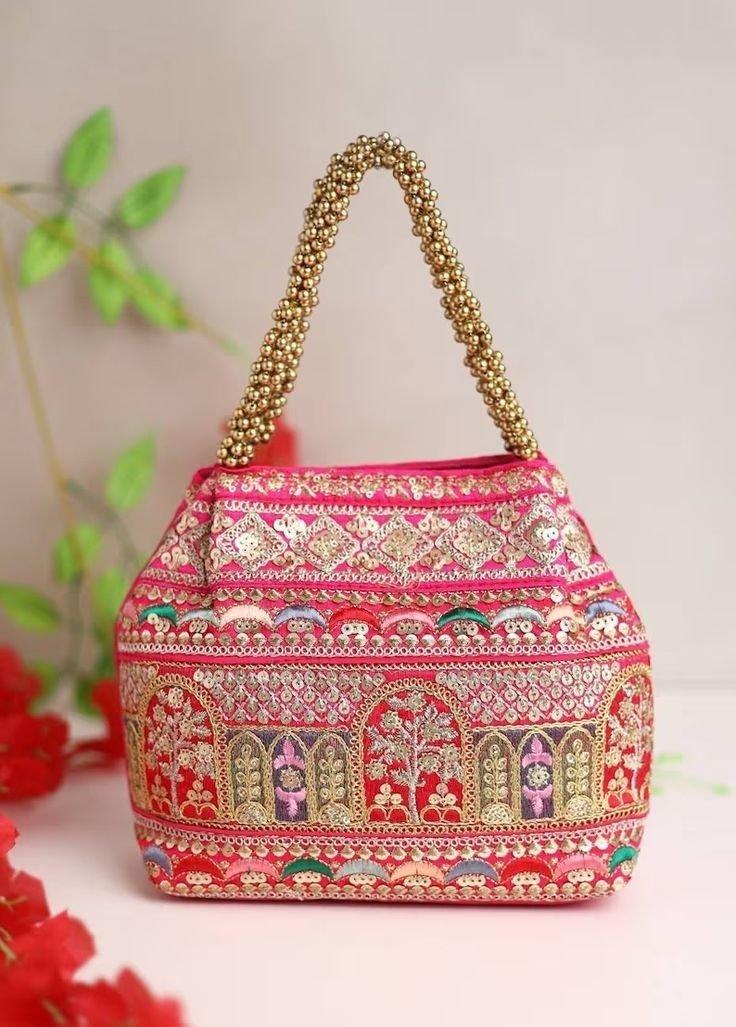 Traditional Banarasi potli bag with rich zari weaving in multicolor patterns. The golden bead handle adds extra charm, making it perfect for bridal and festive outfits.